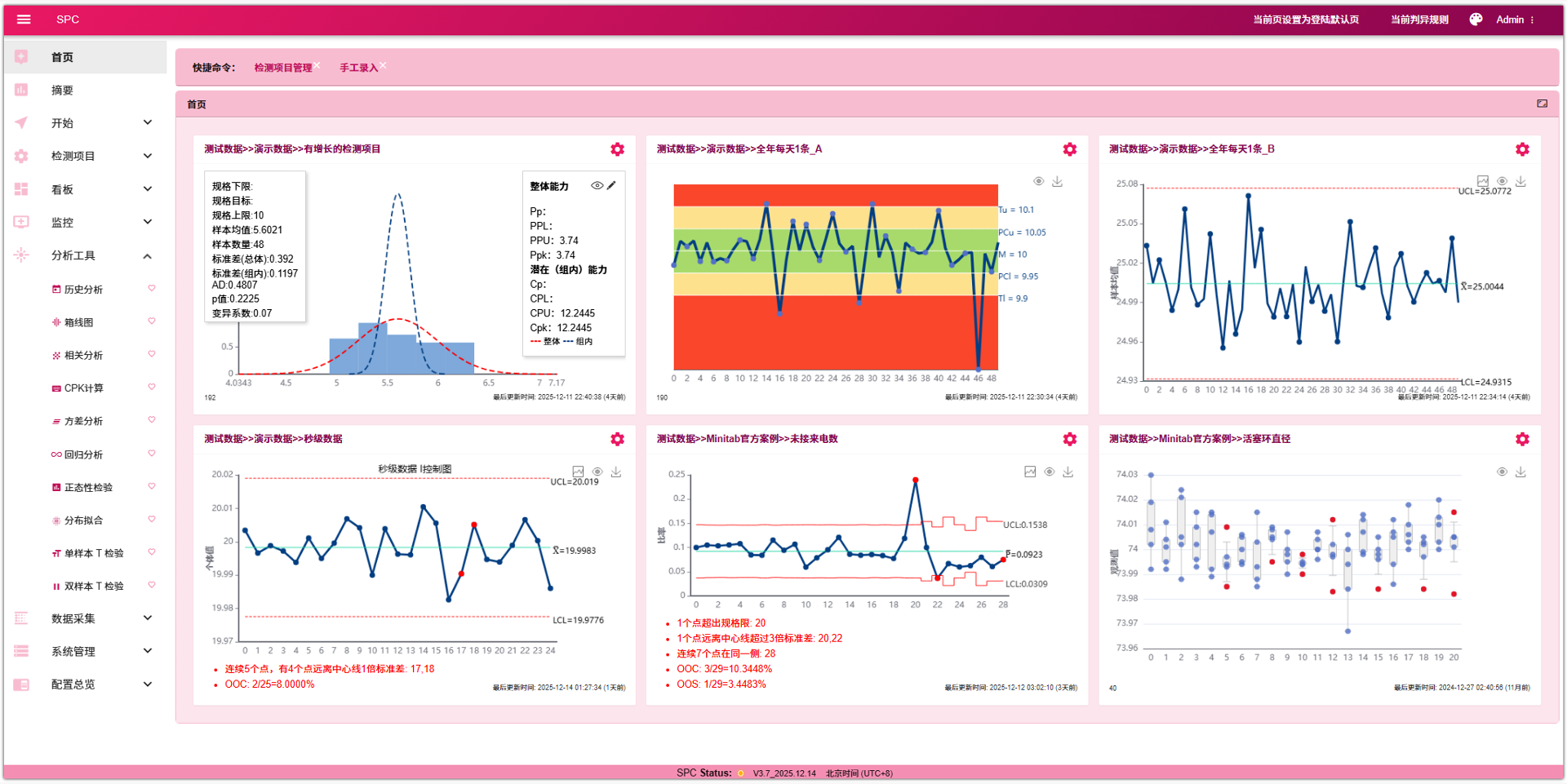 创建任意数量的SPC监控看板:动态看板、综合看板、统计看板,可以包含任意检测项目的SPC控制图、彩虹图、直方图和箱线图,最适合车间大屏使用