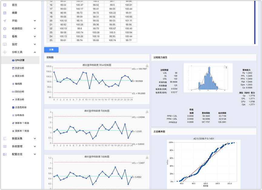 - 仿真与预测:支持根据目标 CPK 设定反向生成随机数据,辅助进行过程能力的模拟预估。