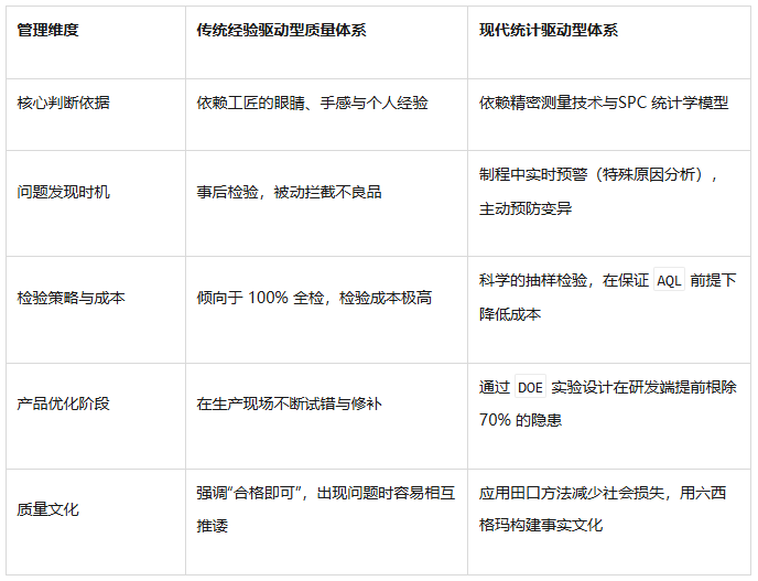 现代质量管理的本质不是事后检验,而是以统计学为核心的预防与持续改进。通过应用SPC(统计过程控制)与六西格玛方法论,将感官检验转化为可量化的数据。在现代制造体系中,标准、测量和统计学缺一不可,它让质量管理从一门手艺升级为可预测、可控制的科学。